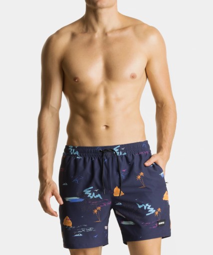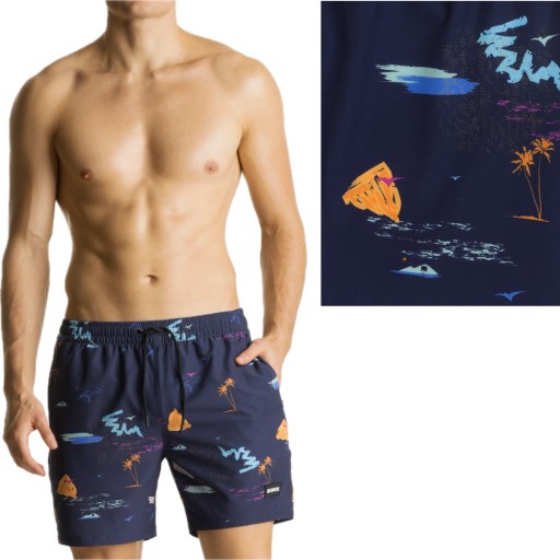 Szorty plażowe pokryte ilustracyjnymi wzorkami w palmy, wysepki, wodę i mewy zachwycą fanów wakacyjnych przygód. Szorty odznaczają się uniwersalnej długości nogawkami, średniej wysokości stanem oraz praktycznymi kieszeniami po bokach. W pasie wiązane są na sznurek. Zapewniające maksymalny poziom wygody szorty wykonane są z przyjemnego poliestru połączonego z delikatnie rozciągliwym elastanem. Szybkoschnący materiał jest odporny na działanie promieni słonecznych - nie traci kolorów ani formy, a swoje właściwości zachowuje przez długi czas użytkowania.