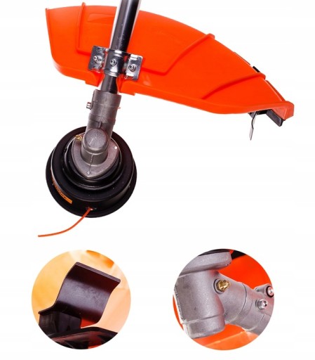 - Osłona głowicy posiada nóż skracający nadmiar żyłki oraz wzmocnioną część stykową z podłożem.
