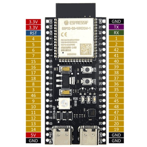 ESP32-S3-DevKitC-1 w wersji N16R8 posiadający rozszerzoną pamięć FLASH do 16MB oraz PSRAM do 8MB. Ten wydajny mikrokontroler bazuje na 32-bitowym procesorze Xtensa LX7 o dwóch rdzeniach i częstotliwości 240 MHz. Do naszej dyspozycji dostajemy 2 porty USB-C - jeden do połączenia po UART, drugi do komunikacji i zasilania modułu. Na płytce znajdziemy diodę LED RGB WS2812B umożliwiającą podstawową komunikację z użytkownikiem, dwa przyciski: BOOT i RESET i diody statusów: zasilania oraz transmisji UART.