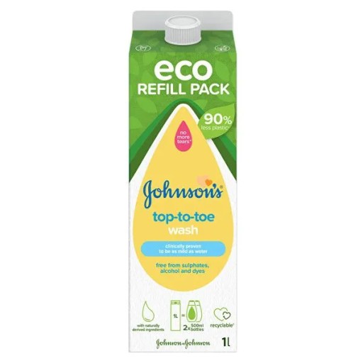 Refill your favourites with our first ever refill pack! An easy, eco conscious way to refill your existing Johnson's® baby bottles at home. 90% less plastic*, 95% naturally derived ingredients, recyclable carton and board from responsible sources. Our top-to-toe wash is suitable from day 1, gently cleanses hair & scalp. Hypoallergenic & ph balanced. Paediatrician & dermatologist tested. Free from parabens, sulfates & dyes. *vs 2 x 500ml bottles.
