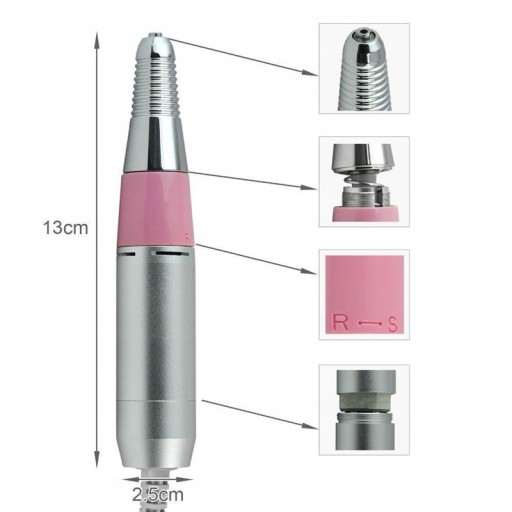Cechy: wykonane z wysokiej jakości materiału ze stali nierdzewnej, konstrukcja długopisu, trwała i solidna do dłuższego użytkowania. Niski poziom hałasu, niski poziom wibracji, wygodny w użyciu. Prędkość do 35000 obr./min. Może być stosowany w maszynie do paznokci model 202/278/288. Lekki dla wygodnego uchwytu, łatwy w obsłudze. Idealny do cienkich i zmieniających kształt paznokci.