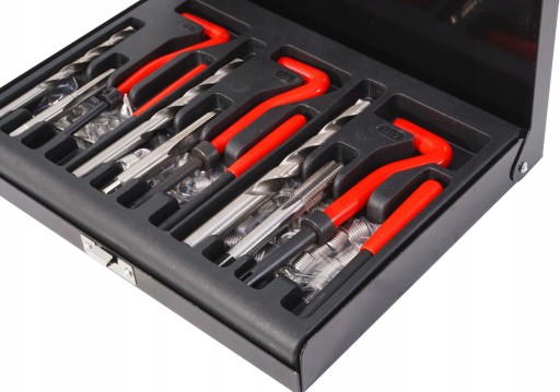 Wysokiej jakości zestaw do naprawy gwintów pozwalający na zastąpienie zniszczonych gwintów nową wkładką gwintową. Wiertła i gwintowniki wykonane zostały ze stali szybkotnącej HSS. Gwintowniki jednostopniowe nacinają gwint, w który wprowadza się wkładkę spiralną z twardej stali nierdzewnej. Do wprowadzenia wkładki służy pokrętło prowadzące oraz wybijak, który obłamuje wystającą końcówkę wkładki.
