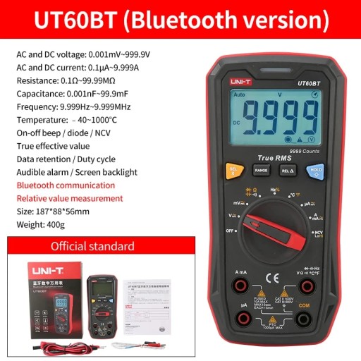 UT60BT to multimetr cyfrowy o zakresie wyświetlania 9999, który umożliwia pomiar rzeczywistych wartości skutecznych napięcia i prądu, zarówno z automatycznym, jak i ręcznym wyborem zakresu. Posiada zabezpieczenie przeciążeniowe 1000 V rms na wszystkich zakresach, zakres prądowy jest chroniony bezpiecznikiem rurkowym 10 A/1000 V, 6,35 x 32 mm. Jeśli podczas pomiaru napięć i prądów zbliżysz się do wartości granicznych ≥990,0V / ≥9,900A, w przypadku przekroczenia wartości granicznych włączy się alarm i wyświetli się znak „OL”. Ponadto umożliwia pomiar rezystancji, pojemności, temperatury, częstotliwości, współczynnika wypełnienia, ciągłości obwodów i przejść półprzewodnikowych. Układ zoptymalizowano do bezkontaktowego pomiaru pola elektrycznego w dwóch podzakresach. Multimetr wyposażony jest w nowoczesny procesor z szybkim przetwornikiem analogowo-cyfrowym (konwersja 3 razy/s) i transmisją mierzonych wartości poprzez Bluetooth w niskoenergetycznej technologii bezprzewodowej 802.15.4. , na telefon komórkowy lub tablet z zainstalowaną aplikacją Connect.