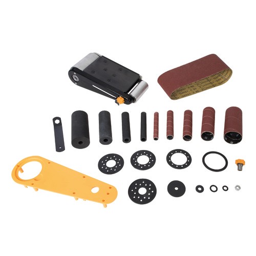 W komplecie: szlifierka, 5 x krążków, 3 x podkładki bębnowe, 4 x wałki gumowe, 5 x tulei P80 szlifujących o średnicy od 13 - 51 mm oraz taśma szlifierska 100x610 mm P80