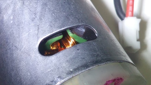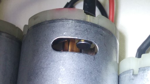 Przez liczne otwory wentylacyjne widać kręcący się wirnik a także komutator i szczotki .