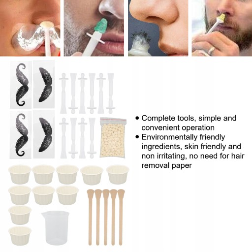 Specyfikacja: Naklejka antyprzylepna do brody, fasola woskowa 50g, kubki papierowe, patyczki do woskowania, patyczki do włosów w nosie, miarka do wagi i instrukcja obsługi