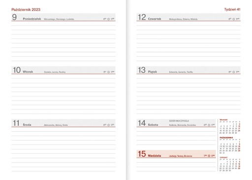 Podręczny kalendarz A5 tygodniowy w oprawie Nebraska zamykanej na gumkę. Dużo miejsca na notatki. Przydatne adresy i linki, rozbudowana część informacyjna wzbogacona o tabele przydatne w pracy pedagoga . Drukowany na białym papierze; bloki terminarza szyte nićmi; kapitałka i tasiemka białe. Kalendarium od 24.06.2024 do 07.09.2025 r. Miesiące VII i VIII w formie skróconej: dwa tygodnie na jednej stronie. Miesiące od IX do VI w układzie tydzień na dwóch stronach. Oprawa umożliwia wykonanie nadruków, tłoczenia i personalizacji kalendarza.