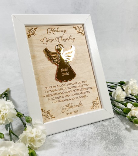 Biała ramka ze złotym Aniołem Stróżem. Przepiękna pamiątka z okazji Pierwszej Komunii Świętej.
