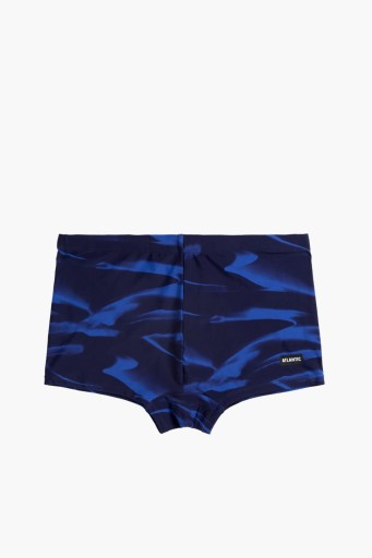 Bokserki kąpielowe męskie marki Atlantic model KMS 318 w granatowo-niebieskim kolorze. Głęboki granatowy materiał został potryty niebieskimi smugami co daje elegancki efekt.
