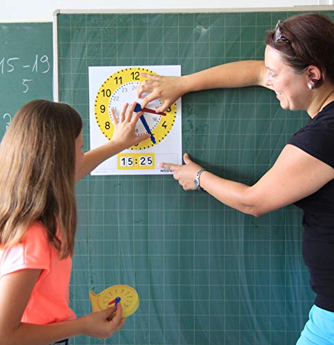 Magnetic learning clock 36 x 29 cm for learning the analogue and digital time display Set contains a magnetises dial, a set of hands and digital number set packed in the cardboard from a magnetic foil, corresponds to the toy standard DIN EN71-3 Made in Germany Product description This watch (36 x 29 cm) is made of a magnetic foil, the dial is printed and the individual hands can be placed on. The learning clock allows you to experiment independently and makes the abstract concept of time and its expressions such as the difference between the system with 24 hours and 60 minutes, the terms half and quarter and the otherwise &usual decimal system more quickly understandable. The supplied magnetic digital numbers can be used to display the respective digital time in the lower area of the magnetic clock and to specify time spans, the duration of which can also be calculated. Use on a magnetic blackboard or table. RE Plastic Our sustainable and pollutant-free RE-Plastic material consists of 100% recycled plastic of the same material type. It is absolutely equivalent in quality as well as optically and haptic ally to the previously used material. Since RE-Plastic can be 100% recycled, we ensure a continuous, effective and responsible recycling cycle. You are welcome to inform yourself about RE-Plastic As a family-owned company Wisner, we have been committed to a conscious sustainable choice of materials for over 40 years and produce exclusively in Germany. We develop innovative and resource-saving production technologies. We are particularly proud of this. Our didactically useful learning and teaching aids and games are not only suitable for kindergartens and schools, but also for use at home. The guiding principle of our products is: active learning seeing, speaking, acting.