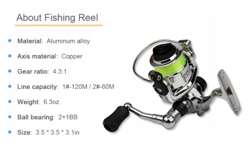 Fishing Reel: Mini spinning reel with fishing line, 4.3:1 gear ratio, 2 1BB with copper axis for smooth and easy operation.