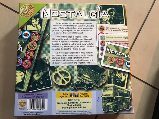 Take a reminiscent ramble through the most momentous of events of the late 20th Century in this game of fads, fashion and fun . a memory-jogging jaunt amongst the good, the bad, the funny and – of course – the downright frivolous! From nodding dogs to pogoing Punks, Hammer Horrors, to frightful fashions, historical events to hysterical happenings, you’ll face a barrage of questions on the weird, the wonderful and the truly awe-inspiring from the 60s, 70s and 80s. If you vaguely remember deely-boppers, macramé pot-holders or trimphones, it’s time to plump up the beanbag, light the lava lamp, crack open a Party Seven and settle down to a recollection of long-forgotten facts! Contents: Nostalgia and Decade card decks, playing board, playing pieces and rules.