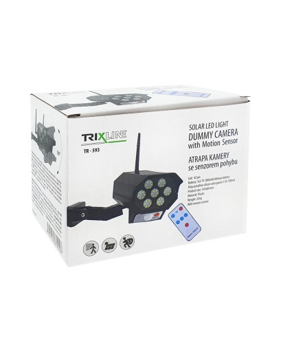 Zewnętrzne mocne oświetlenie LED Trixline - imitacja kamery CCTV posiada wbudowany panel słoneczny, czujnik ruchu z detekcją pod kątem 120° i zasięgiem 3-5m. Czujnik zmierzchu - ładuje się w dzień i świeci w nocy. Dzięki panelowi słonecznemu oszczędzasz energię i nie jesteś ograniczony podłączeniem do sieci energetycznej. Światło przypomina kamerę, oświetla przestrzeń i tym samym utrudnia przemieszczanie się niepożądanych osób. Świetny wybór do oświetlenia okolic domu, ogrodów, podjazdów, placów budowy, garaży, parkingów, działek rekreacyjnych, domków letniskowych, pól namiotowych itp. Wykonana z wysokiej jakości tworzywa sztucznego o stopniu ochrony IP44. W zestawie znajduje się pilot zdalnego sterowania. Łatwy montaż. Zalecana wysokość montażu 2-3 m nad podłożem.