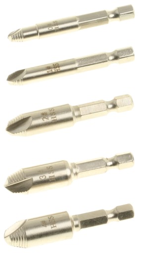 Profesjonalny 5-elementowy zestaw wykrętaków do odkręcania złamanych śrub. Wykonane są ze stali szybkotnącej HSS, co zapewnia wytrzymałość i trwałość narzędzi. W zestawie znajduje się 5 wykrętaków o różnych średnicach i chwycie sześciokątnym 1/4".