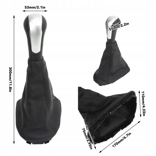 1. Elegancki wygląd: zestaw osłon gałki zmiany biegów w samochodzie zawiera czarną osłonę przeciwpyłową ze skóry PU i srebrną głowicę zmiany biegów, aby dodać luksusowy i nowoczesny wygląd Twojemu samochodowi oraz świeży i stylowy wygląd gałki zmiany biegów.