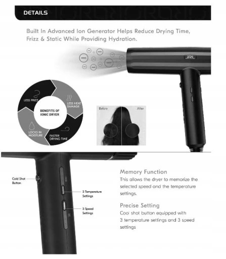 Wbudowany zaawansowany generator jonów pomaga skrócić czas schnięcia, puszenia się i elektryzowania, zapewniając jednocześnie nawilżenie