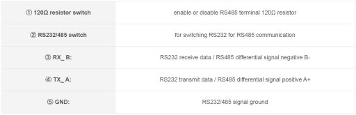 - Posiada obwód przełączający komunikację RS232/485, który można skonfigurować za pomocą przełącznika.