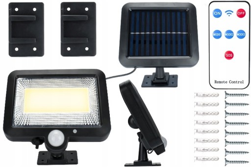 ✅ ZAWARTOŚĆ OPAKOWANIA: naświetlacz solarny, panel fotowoltaiczny, pilot, przewód 5m, 2x uchwyt montażowy, 8x śruba montażowa, 8x kołek montażowy