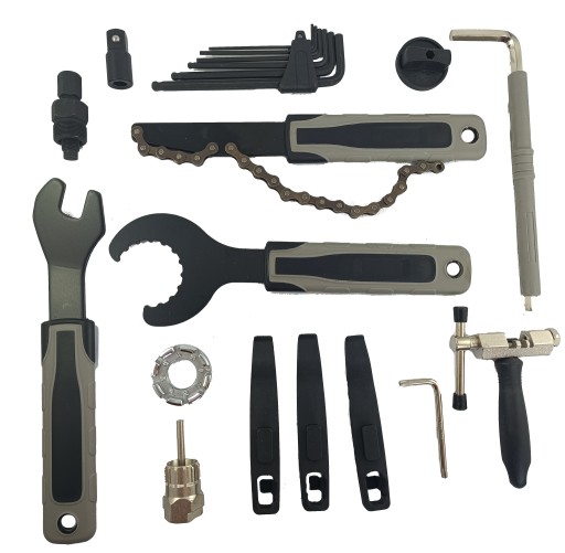 Klucz do kasety oraz klucz do zewnętrznych suportów zapewniają niezawodną obsługę mechanizmów napędowych, podczas gdy klucz do pedałów oraz klucz imbusowy 8mm umożliwiają szybkie i precyzyjne regulacje pedałowania.