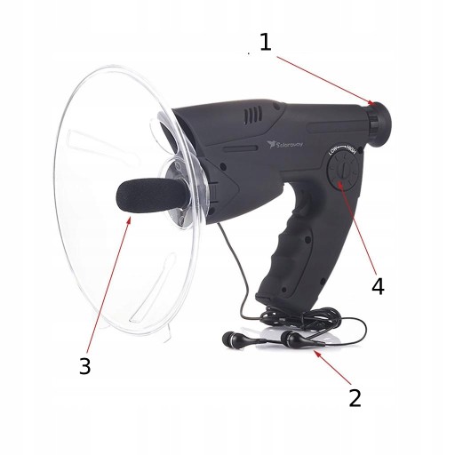 Paraboliczna antena skupiająca dźwięk pozwala na świetny odbiór dźwięków, a zintegrowany obiektyw z przybliżeniem x8 pozwala na obserwacje np. nasłuchiwanego ptaka lub podsłuchiwanej osoby.