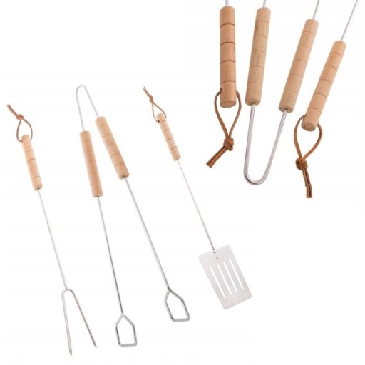 - Przybory do grillowania wykonane z wysokiej jakości stali nierdzewnej w kolorze srebrnym oraz drewnianej rączki.