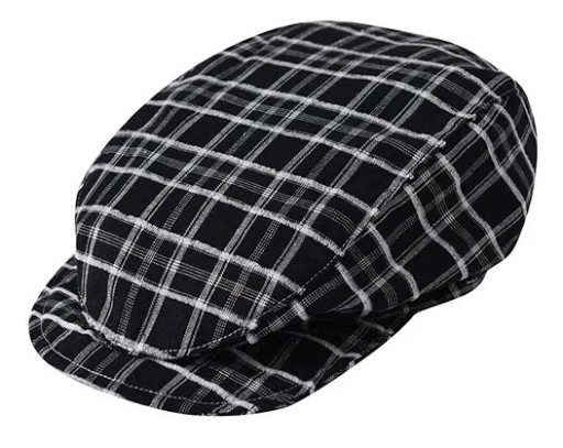 Kamizelka, spodnie, kaszkiet oraz mucha (zapinana na gumkę do guzika) z czarnej tkaniny w kratkę.