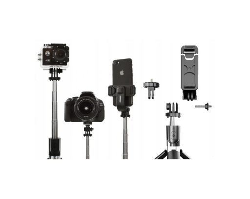 • Możesz go stosować jak klasycznego kija selfie trzymając go w ręce i mocując do niego kamerę, telefon, aparat cyfrowy czy jakiekolwiek inne urządzenie z gwintem 1/4" lub mieszczące się w ramionach uchwytu (aż do 10 centymetrów).