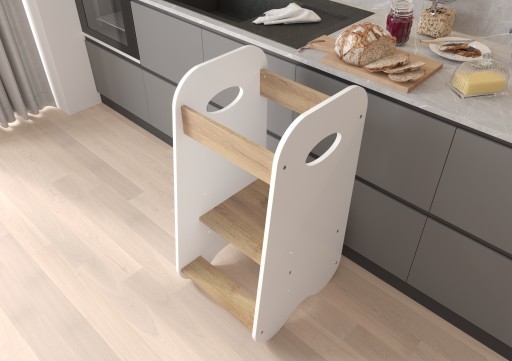 Nasz kitchen helper został wyprodukowany w Polsce. Jest lekki i stabilny. Zabezpieczony podest posiada regulację na dwóch wysokościach: 22 cm, 30 cm licząc od podłogi, dzięki której będzie dłużej służył Twojemu dziecku. Produkt wyprodukowany z wysokiej jakości materiału jakim jest płyta meblowa.