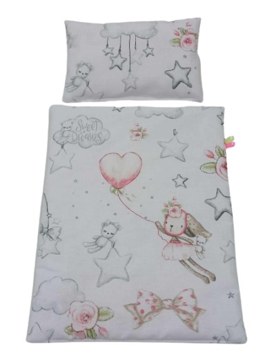Zestaw pościeli jest dwustronny - zarówno kołderka, materacyk, jak i poduszka, wypełnione są antyalergiczną, puszystą włókniną.