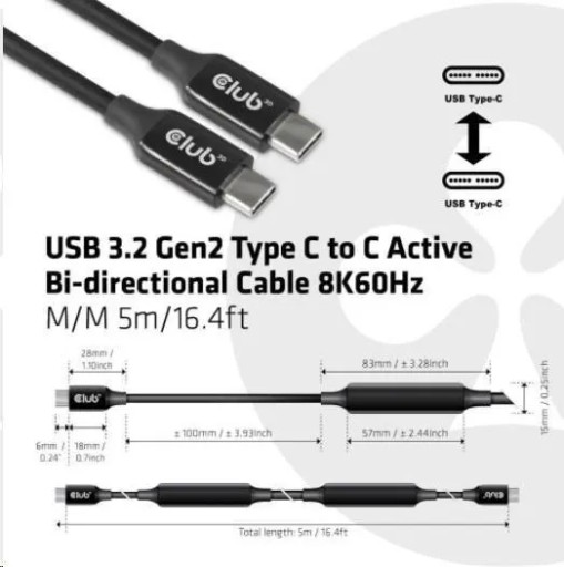 CLUB3D CAC-1535. Długość kabla: 5 m, Złączka 1: USB C, Złączka 2: USB C, Wersja USB: USB 3.2 Gen 2 (3.1 Gen 2), Maksymalna szybkość przesyłania danych: 10000 Mbit/s, Kolor produktu: Czarny