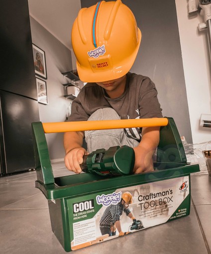 Skrzynka z narzędziami wraz z wkrętarko - wiertarką została stworzona przez uwielbianą przez dzieci firmę WOOPIE. W skład zestawu wchodzi ciemno-zielona, pojemna skrzynka na narzędzia z wygodną, żółtą rączką oraz 15 elementów. Wśród narzędzi dzieci odnajdą bezprzewodową wkrętarko-wiertarkę na baterie z 3 wymiennymi końcówkami.
