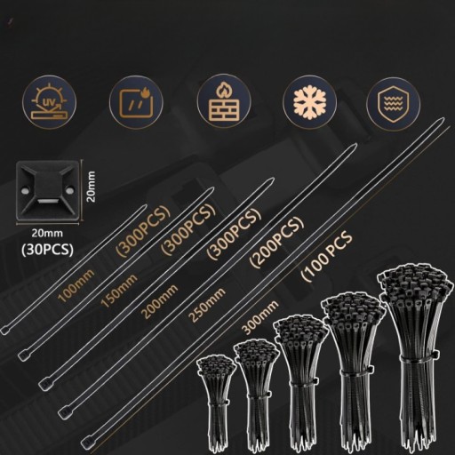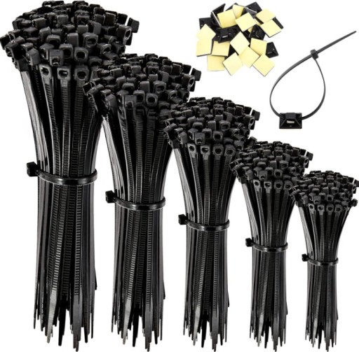 Zawiera 1200 sztuk mocnych nylonowych opasek kablowych 30 sztuk samoprzylepnych podstaw (20 x 20 mm).