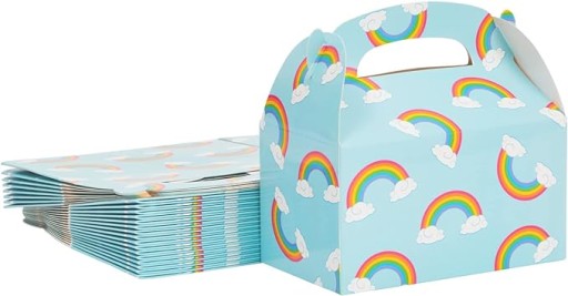 - Zestaw od Blue Panda zawiera 24 pudełka imprezowe z motywem tęczy na drobne upominki i smakołyki