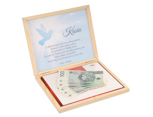 Drewniane pudełko na czekoladki i pieniądze - prezent na komunię.