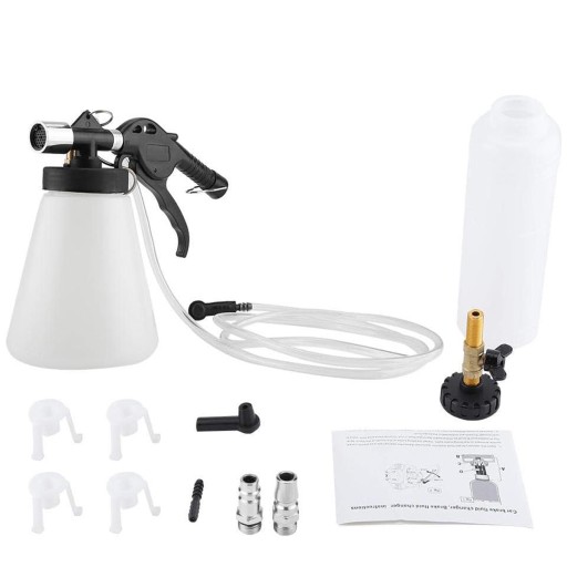 - Po podłączeniu kanistra do sprężarki powietrza (brak w zestawie), podłącz przewód odpowietrzający do hamulca i włącz odpowietrznik, a następnie pociągnij za spust. Zablokuj na miejscu, pozwól mu spłynąć przez 4-5 minut, wyłącz odpowietrznik i sprawdź nacisk na pedał hamulca