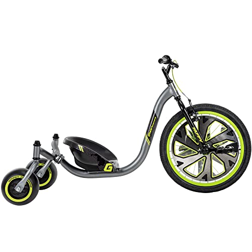 Product Description Huffy Green Machine Drift Trike includes super-spin rear wheels for aggressive slides, amazing spins and incredible fun. The rear wheels of the Super spin swivel for dramatic sliding and spinning escapades. As you play, the 20-inch pneumatic front tyre grips the surface for great spinning action, allowing you to unleash 360-degree spins and spectacular drifts. This versatile ride-on comes with an easy-to-adjust handlebar and an adjustable bucket seat, allowing you to customize the fit for your child. The rider is held and supported by the high sidewalls of the bucket seat as they zip through curves and do epic drifts and spins. With the dual-action handbrake and freewheel, you can keep control of the action. The Huffy Green Machine Drift Trike is built to last with a steel frame and handlebar. Safety Warning Wear suitable protective clothing.