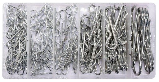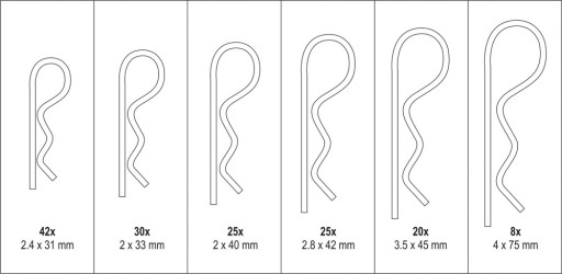 Zestaw 150 sztuk zawleczek sprężystych. Zestaw zawiera 6 rozmiarów od 2.4x31 mm do 4.0x75 mm. Całość umieszczono w wygodnym opakowaniu typu "sortownik".