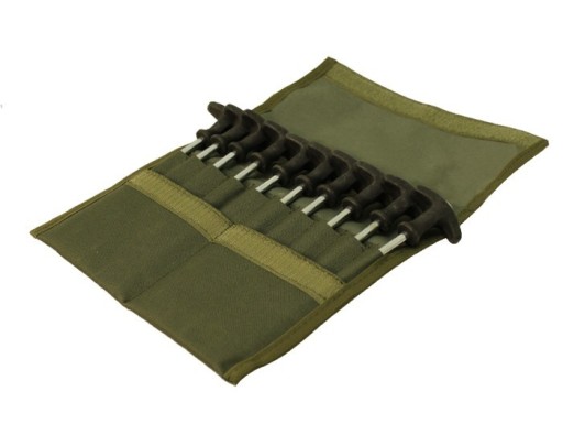 Uniwersalny zestaw 10 szpilek do namiotów. Zestaw mieści się w praktycznej, zamykanej na rzepy saszetce z materiału. Szpilki są bardzo trwałe. Szpilki zostały wykonane ze stalowych prętów o średnicy 7 mm.
