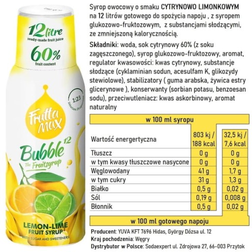 Syrop owocowy na 12 litrów gotowego napoju z izotopami i substancjami słodzącymi o obniżonej zawartości cukru.