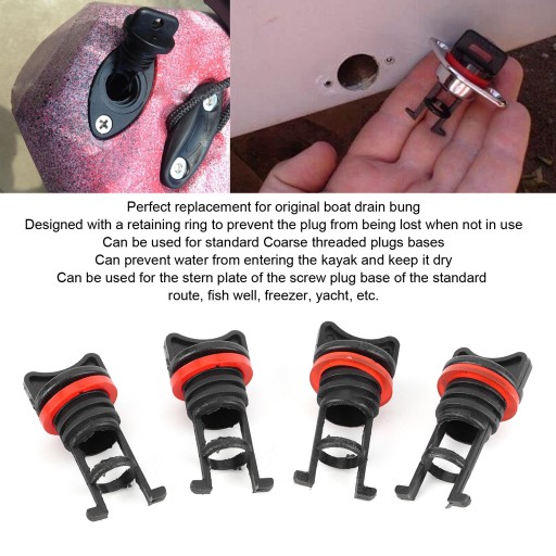 1. Idealny zamiennik oryginalnego korka spustowego łodzi, wyposażony w podkładkę PE. 2. Zaprojektowane z pierścieniem ustalającym, aby zapobiec zgubieniu wtyczki, gdy nie jest używana, i może być używane ze standardowymi podstawami wtyczek z grubym gwintem. 3. Po użyciu może zapobiec przedostawaniu się wody do kajaka i utrzymywać go w suchości, co jest bardzo praktyczne. 4. Można go zastosować do płyty rufowej podstawy korka gwintowanego standardowej trasy, studni rybnej, zamrażarki, jachtu itp. 5. Opakowanie zawiera 4 sztuki zatyczek spustowych na przynęty, co w zupełności wystarczy do codziennego użytku.