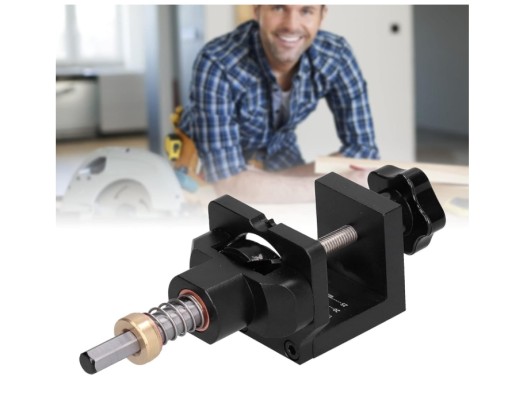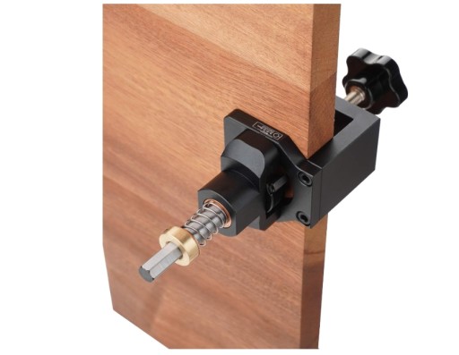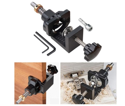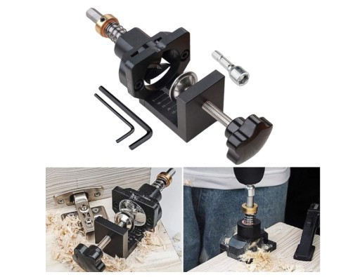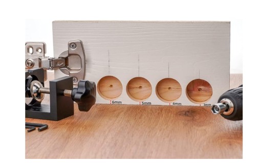 Prowadnica do wiercenia otworów pod zawiasy z urządzeniem zaciskowym do pozycjonowania osi, regulacji położenia marginesu i łatwej obsługi