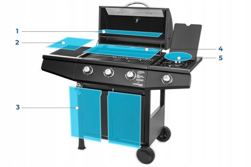 W zestawie - wąż + reduktor! ✔Żeliwny ruszt ✔dodatkowa półka nad rusztem + półka boczna+ półka palnikowa ✔Termometr ✔otwieracz do butelek ✔haczyki na akcesoria