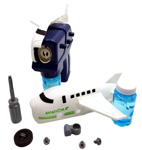 Pistolet potrzebuje 3xbaterii AA (brak w zastawie)i posiada w zestawie aż 2 pojemniki z płynem. Dodatkowo kabinę samolotu, koła i silniki można zdemontować / rozkręcić używając do tego specjalnego śrubokręta, który jest w zestawie.