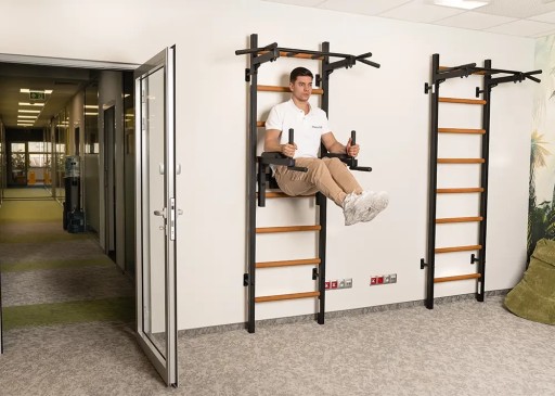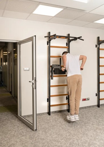 Zestaw zawiera: drabinkę, stały drążek do podciągania z 6-cioma uchwytami, poręcze do ćwiczeń z podparciem pod plecy