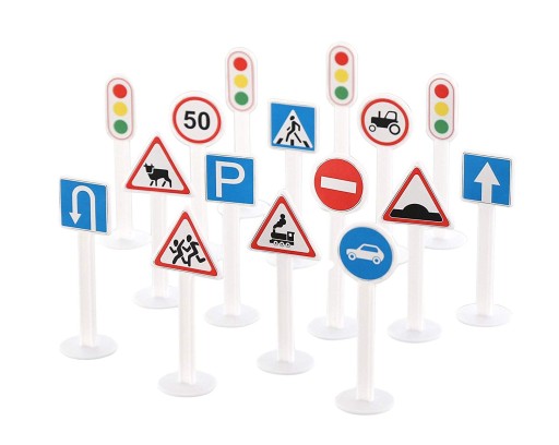Zestaw znaków drogowych do nauki zasad ruchu drogowego.