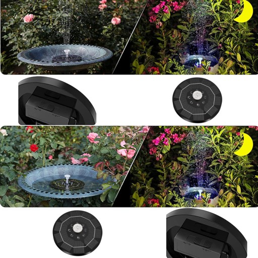 - W ciągu dnia fontanna solarna będzie przyciągać różne ptaki, takie jak kolibry. Wieczorem Ty i Twoja rodzina możecie cieszyć się wspaniałym pokazem świetlnym. Idealny do stawów, basenów, dekoracji ogrodowych, basenów, tarasów, dekoracji ogrodowych i wody pitnej dla zwierząt.