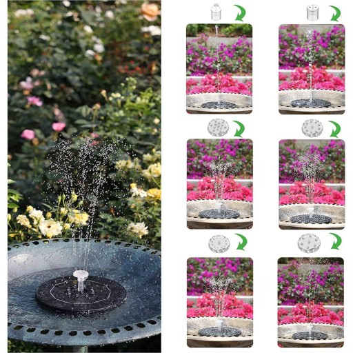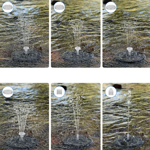 - Solarna fontanna do kąpieli dla ptaków ma 6 dysz, które odpowiadają różnym potrzebom w zakresie wysokości i kształtu strumienia wody. Maksymalna wysokość strumienia wody: 50 cm/20 cali. Wysokość strumienia wody będzie inna w przypadku podłączenia różnych dysz.