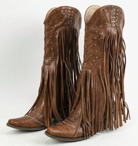 DAMSKIE KOZAKI BRĄZOWE Z FRĘDZLAMI KLOCEK