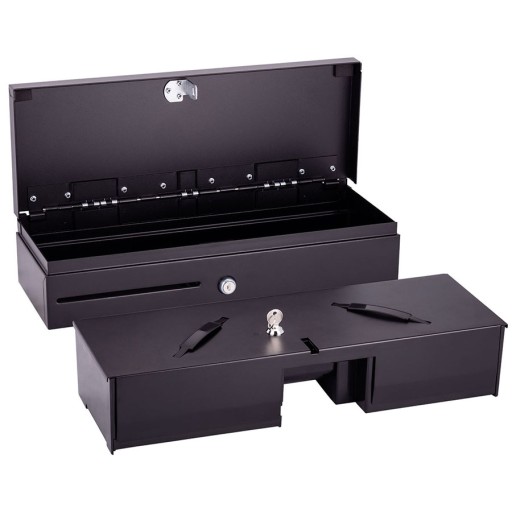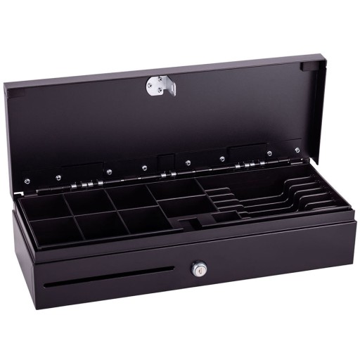 Szuflada otwierana do góry przeznaczona do instalowania na krawędzi blatu/lady. Stalowa obudowa z czterema otworami montażowymi w dolnej części, lakierowana proszkowo na kolor czarny. Szuflada posiada wymienną, plastikową kasetkę na pieniądze (7 na banknoty, 8 na bilon oraz dodatkowy schowek na bony towarowe, potwierdzenia zapłaty itp.). Pojemniki na banknoty można konfigurować według własnych potrzeb. Wkład na pieniądze zabezpieczony jest dodatkową metalową pokrywą z zamkiem (2 kluczyki), dzięki temu każdy kasjer może posiadać własną kasetkę.W standardowym wyposażeniu dwupozycyjny zamek oraz dwa kluczyki. Istnieje możliwość otwierania szuflady poprzez: impuls elektryczny z kasy lub kluczykiem.