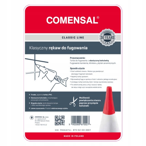 Wygodny rękaw do fugowania marki COMENSAL umożliwiający dokładne i szybkie wypełnienie spoin w powierzchniach z kamienia, klinkieru i płytek ceramicznych.